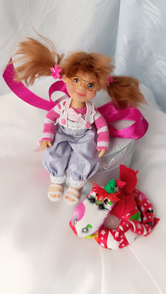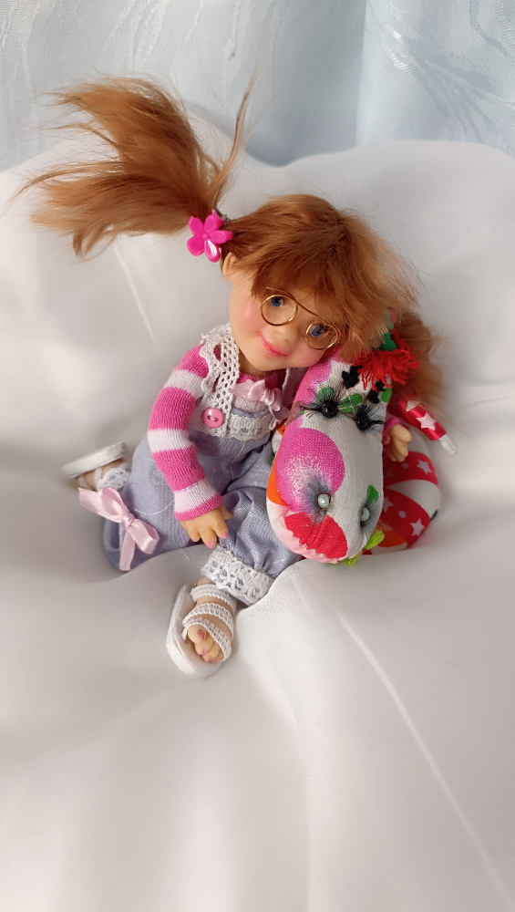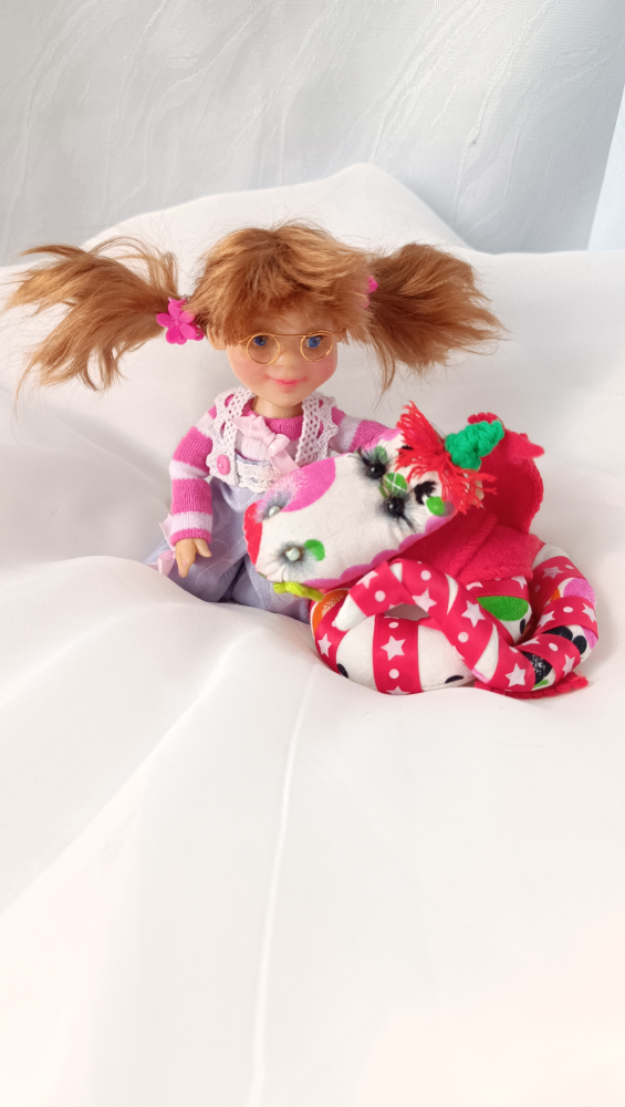 Малышка 18см. Может быть игровой. Полностью подвижна. Голова поворотная из запекаемого пластика, волосы - натуральная шерсть ангорской козочки. Удав - текстиль.